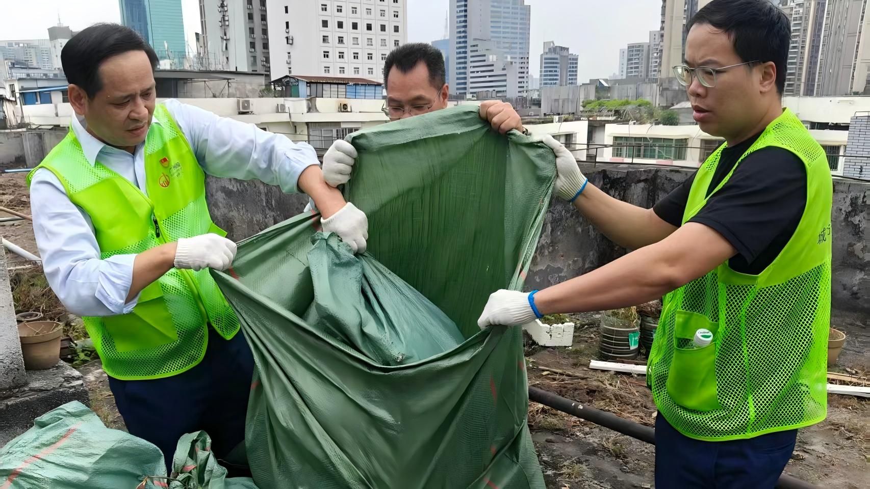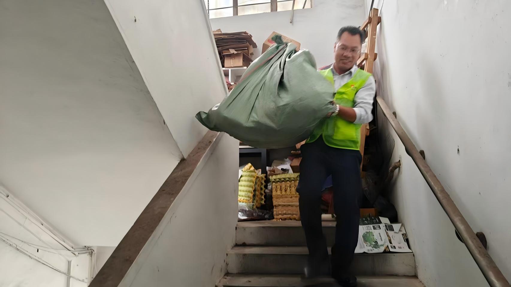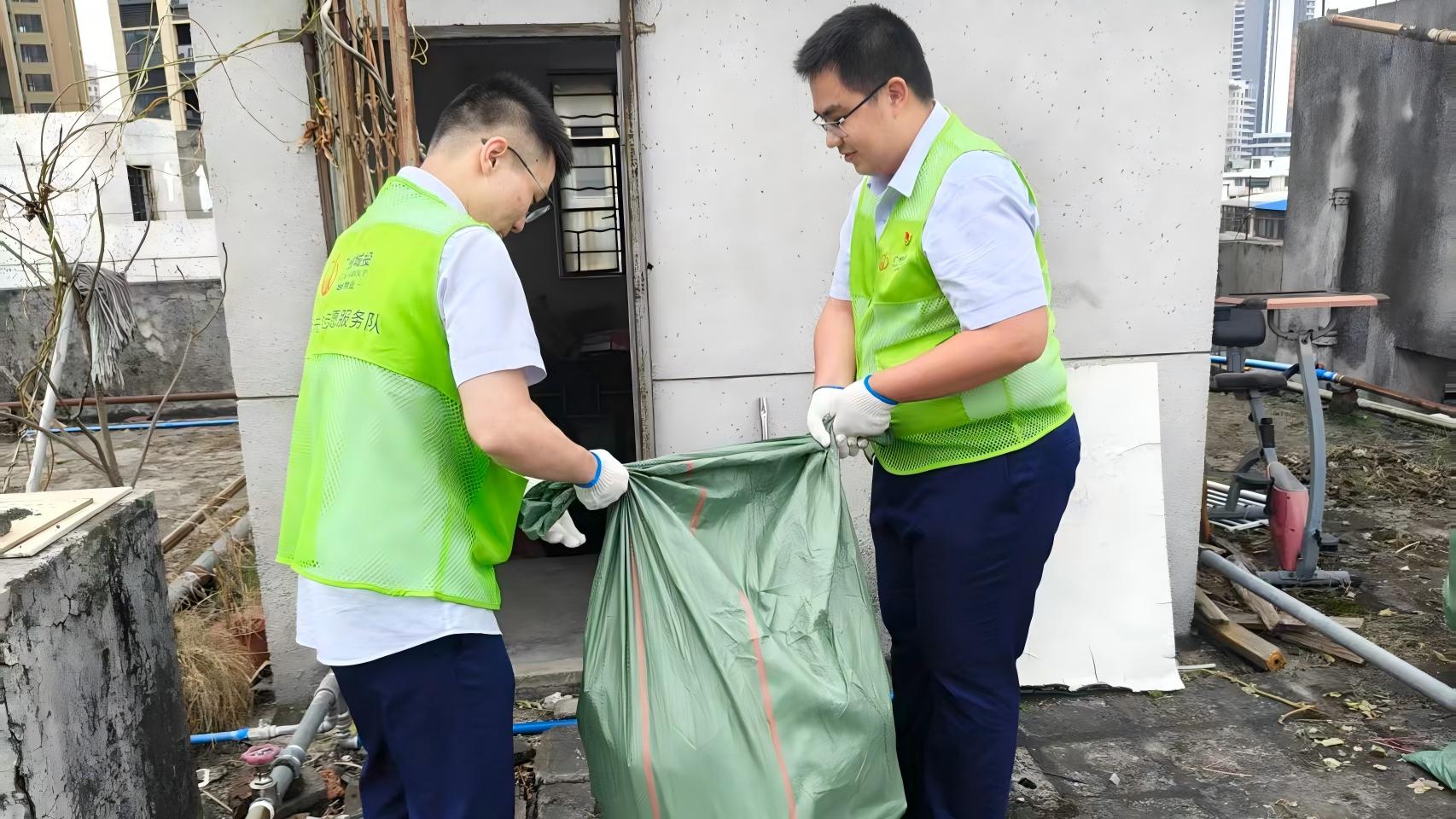 针对社区部分楼栋顶楼长期堆放杂物的问题,志愿者们发挥攻坚克难的精神,将杂物逐一打包,从十楼顶层有序运送至楼下指定存放点,共清理杂物十余包,有效消除蚊媒孳生隐患,为社区公共卫生安全筑牢“第一道防线”。