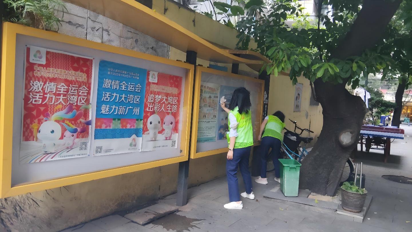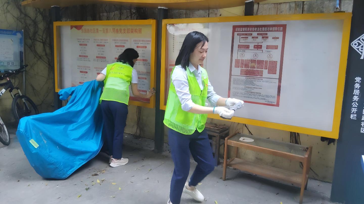 在社区公共区域,志愿者们对社区宣传栏等设施进行全面的清洁维护。细致清理玻璃表面及边框缝隙中积尘与污渍,使宣传栏焕然一新,提升了社区整体的环境和品质。